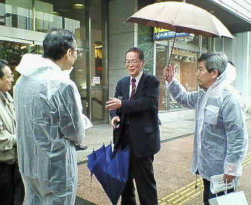 4月17日 雨の中「香椎花園前駅の森を守る会」の西鉄本社前街頭活動。